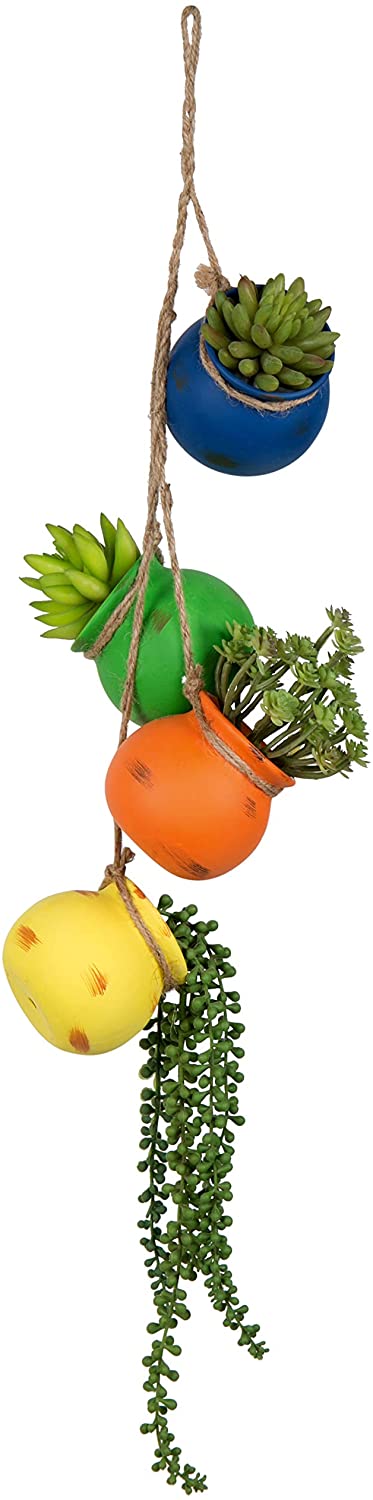 The bright colors and random arrangement of pots in this hanging cluster of planters brings a cheery energy to porches or other outdoor living spaces. At just 4 inches each, the blue, green, orange, and yellow cauldron-shaped pots are great for accenting trellis walls or veranda beams, and the angled position of each pot gives each plant their own personal space for growth.